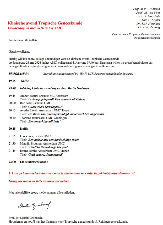 U kunt zich aanmelden door een mail te sturen naar secr.infectieziekten@amsterdamumc.nl