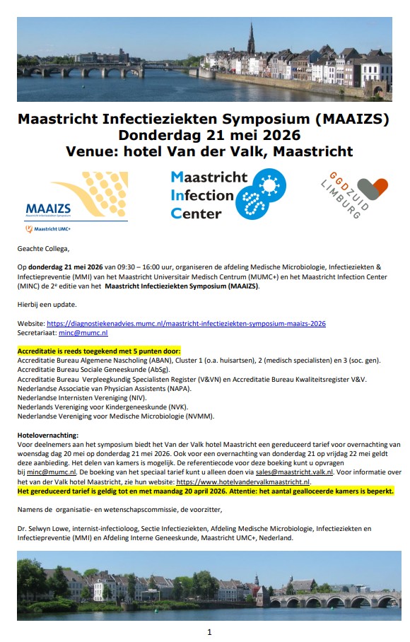 Voor deelnemers aan het symposium biedt het Van der Valk hotel Maastricht een gereduceerd tarief voor overnachting van woensdag dag 20 mei op donderdag 21 mei 2026. Ook voor een overnachting van donderdag 21 op vrijdag 22 mei geldt deze aanbieding. Het delen van kamers is mogelijk. De referentiecode voor deze boeking kunt u opvragen bij minc@mumc.nl. De boeking van het speciaal tarief kunt u alleen doen via sales@maastricht.valk.nl. Voor informatie over het van der Valk hotel Maastricht, zie hun website. Het gereduceerd tarief is geldig tot en met maandag 20 april 2026. Attentie: het aantal gealloceerde kamers is beperkt
