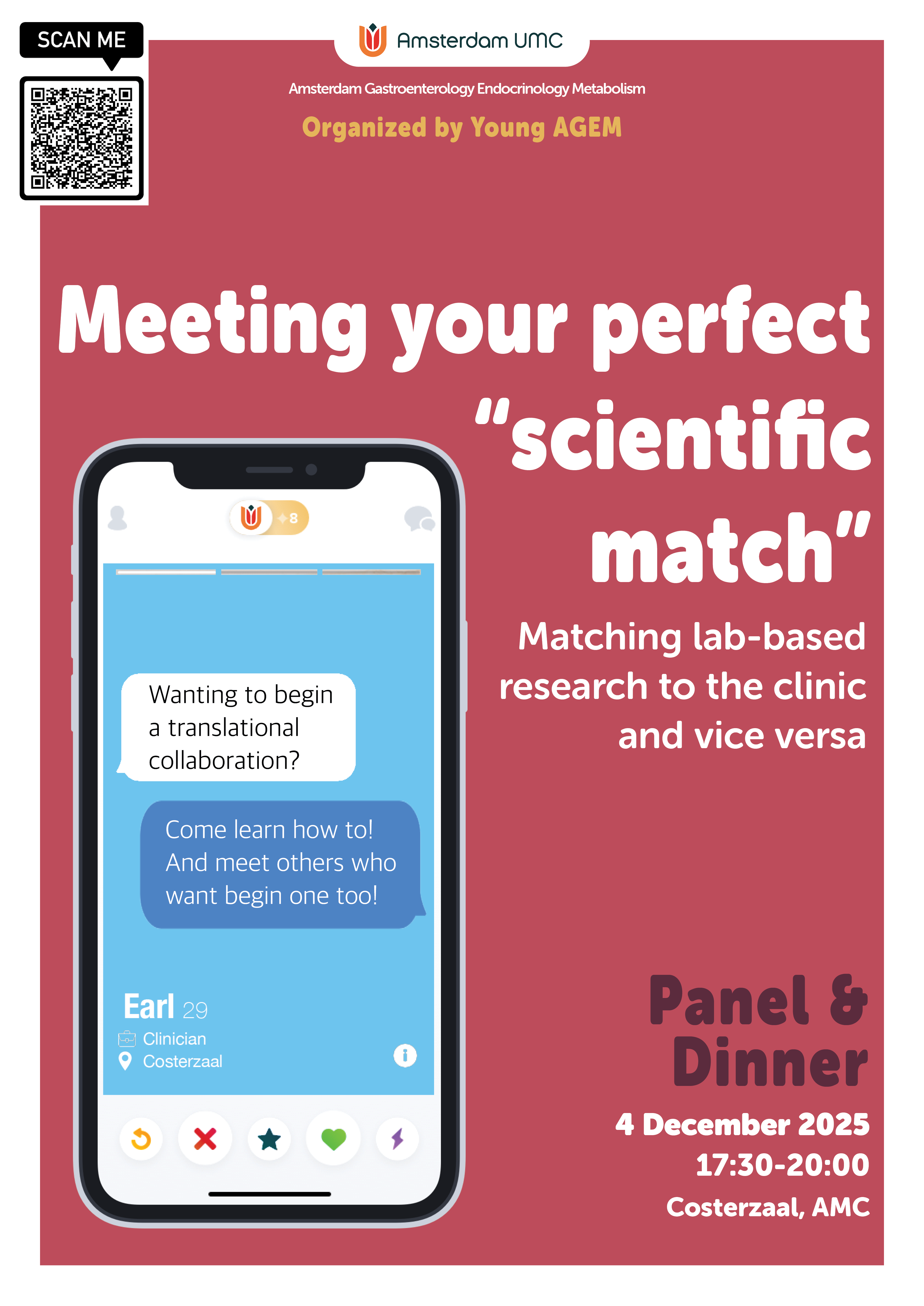 Then join the "Scientific match" event organized by Young AGEM and ask all your questions during the panel discussion with Amsterdam UMC researchers who have initiated great translational collaborations!