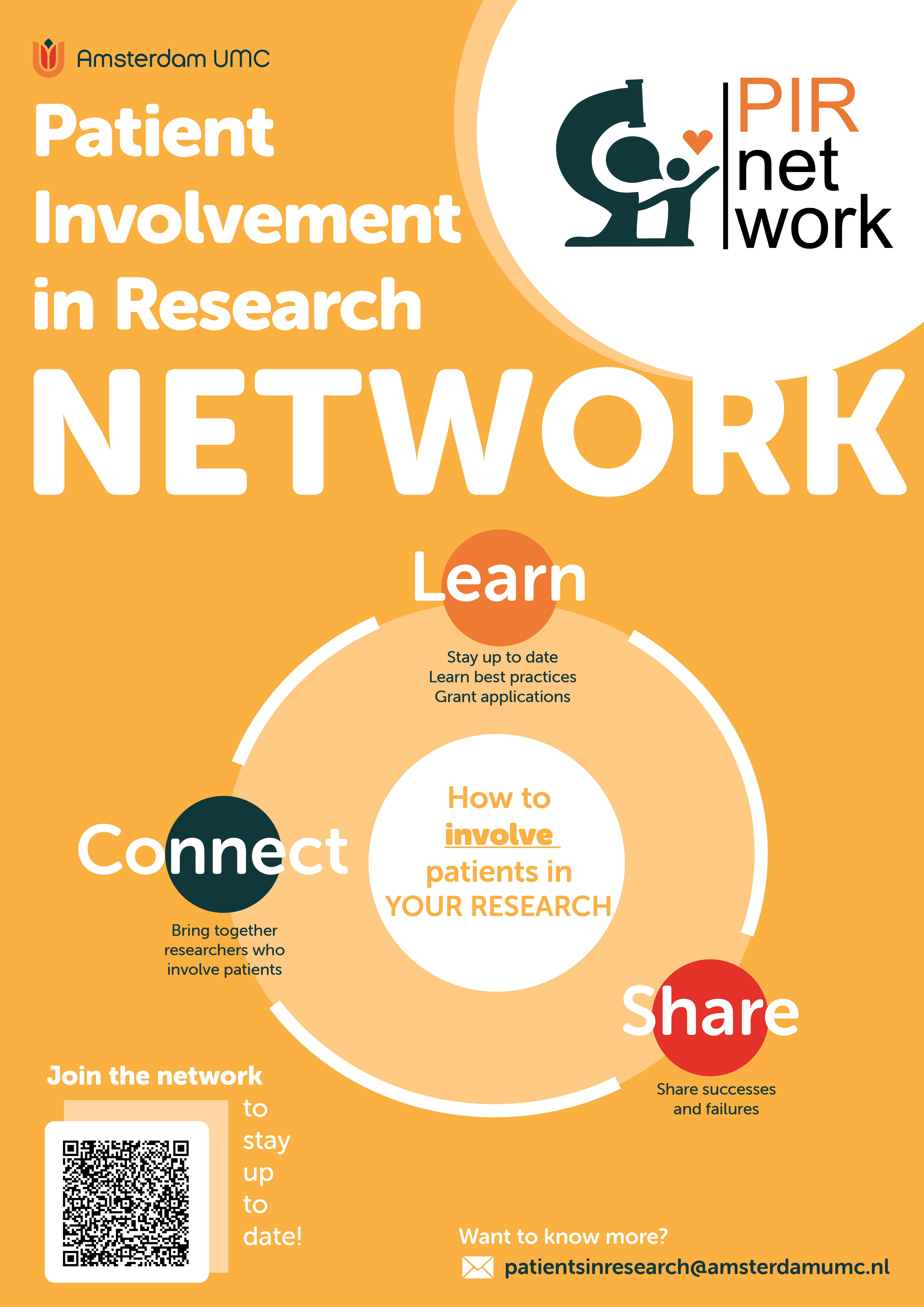 Ready to get started? Register for the PIR Network today and discover how patient involvement can enrich your research. For questions or more details, please reach out to patientsinresearch@amsterdamumc.nl.