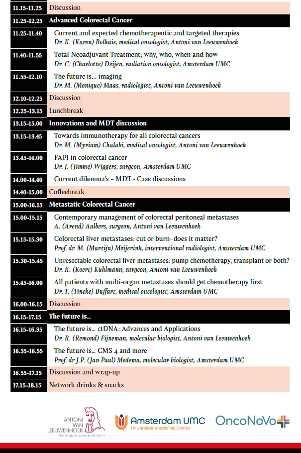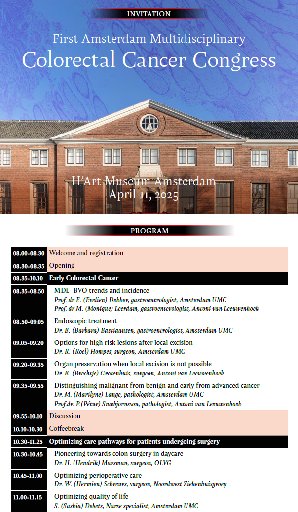 It is with great enthusiasm that we invite you to an inspiring one-day conference in the center of Amsterdam. This day is fully dedicated to the latest insights in the diagnosis and treatment of colorectal cancer.