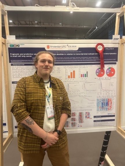 Stef Elings, PhD candidate in Pathology and member of the Amsterdam Institute for Immunology and Infectious Diseases (AI&I), was awarded the AI&I travel grant in 2025, which enabled him to attend the European Society for Medical Oncology (ESMO) 2025 conference in Berlin, Germany. At the conference, Stef’s poster was recognized with the Best Poster Award in the Small Cell Lung Cancer (SCLC) category.