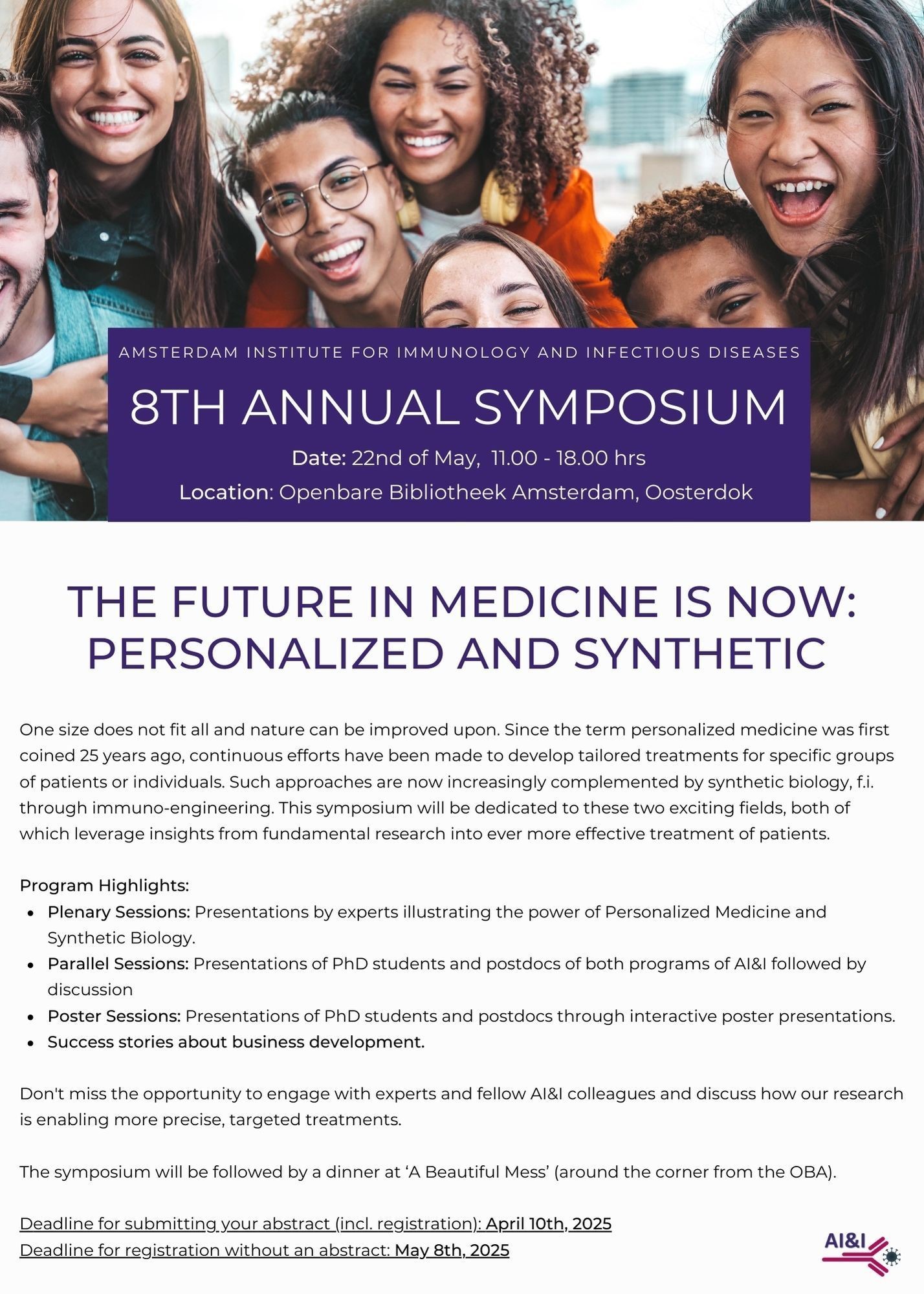 From all the submitted abstracts, six outstanding abstracts from each theme (Immunology and Infectious Diseases) have been selected for presentations during the parallel sessions. The abstracts not selected for an oral presentation, will be scheduled for a poster presentation.