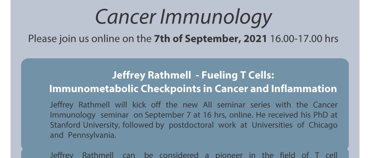 Jeffrey Rathmell will kick off the new AII seminar series with the Cancer Immunology seminar on September 7 at 16 hrs, online. He received his PhD at Stanford University, followed by postdoctoral work at Universities of Chicago and Pennsylvania. Jeffrey Rathmell can be considered a pioneer in the field of T cell immunometabolism. From around the year 2000 he has worked on the role of CD28 and cytokines in regulating glucose metabolism in T cells. Currently at VanderBilt University in Nashville, his group studies both immunologic and cancer metabolism, aiming to identify mechanisms by which cell metabolism modulates inflammatory diseases and anti-tumor immunity as well as growth and proliferation of cancer cells.