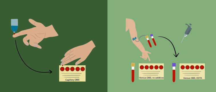 They discovered that leftover blood collected from the arm in tubes, called venous blood, can be used to make dried blood spots, by pipetting droplets of venous blood on filter paper (figure 1). Results of steroid hormone analysis are comparable to the results obtained from dried blood spots made from blood collected from a small blood vessel, called a capillary, via a finger prick. This means that laboratories can develop and validate new dried blood spot methods easier by using leftover blood from blood that hospitals already collect, without having to collect extra finger prick samples from volunteers.