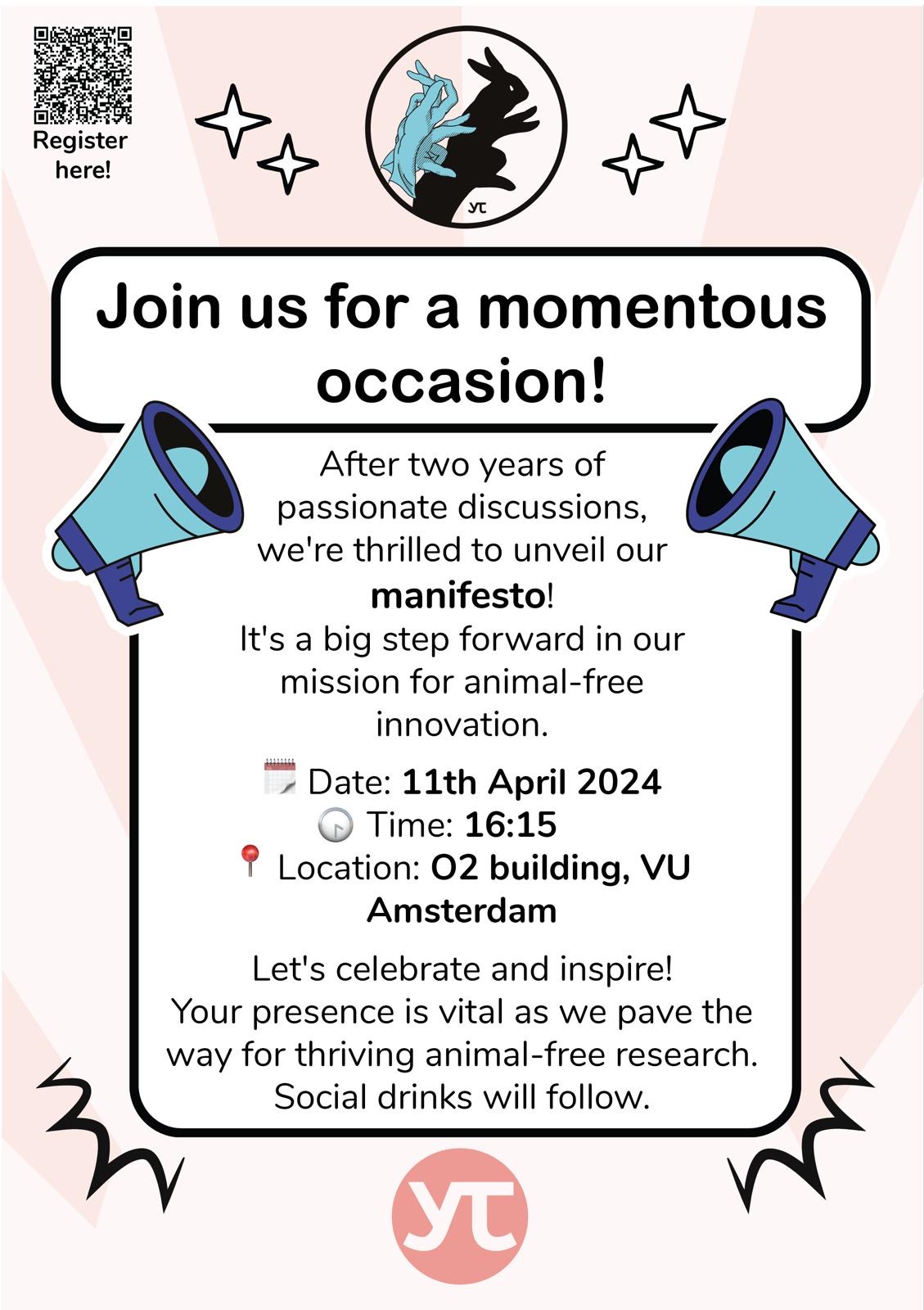 Join their Manifesto event on April 11th at the VU Amsterdam! They will present the voice of all of us, the young people who want to go animal testing free, and gain new knowledge together in the field of transition science. Of course, this is a perfect opportunity to network as well, so please join them for drinks after the event!