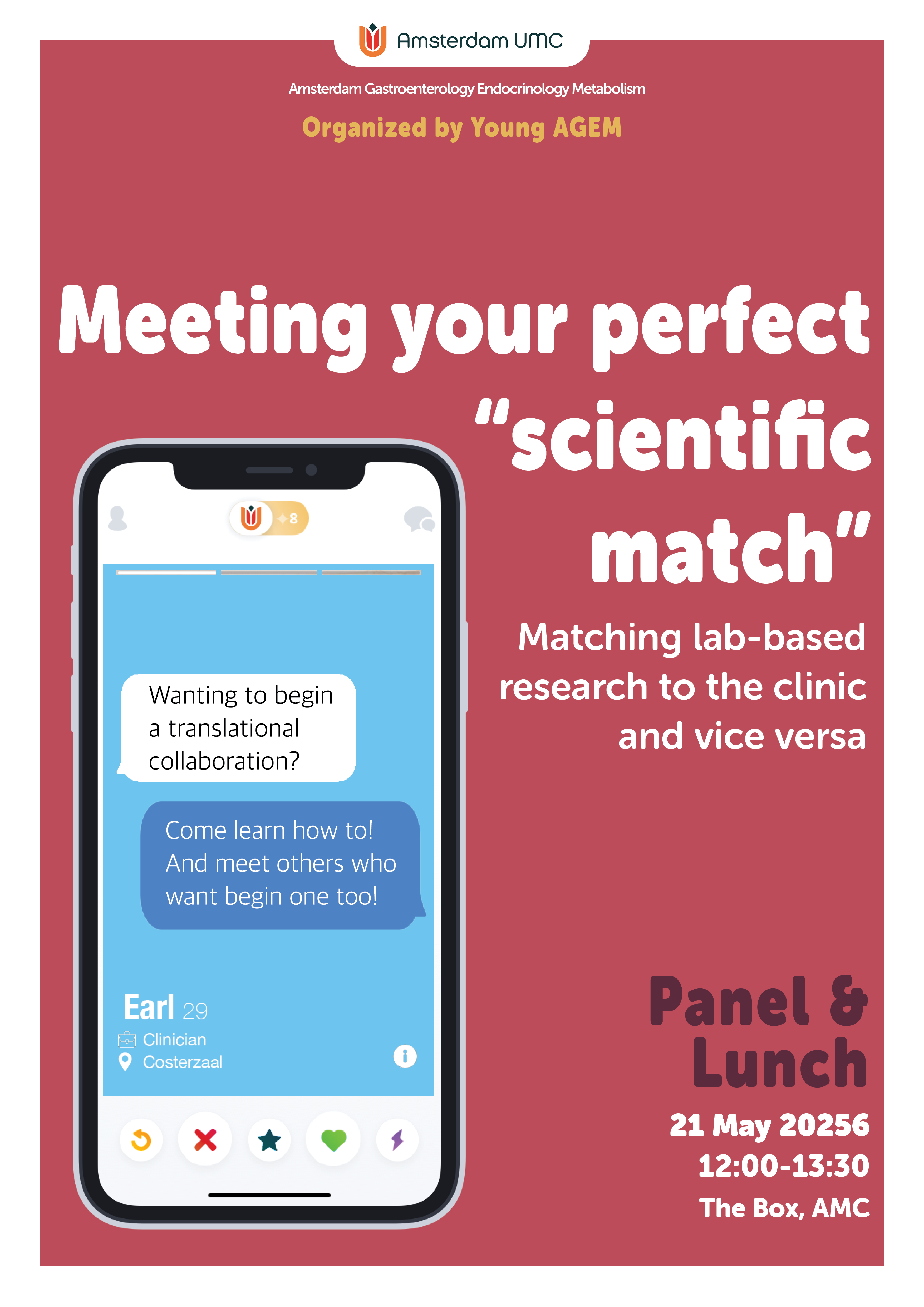 On Thursday May 21st, 2026 an insightful lunch event entitled: "Finding your perfect scientific match - from lab based research to the clinic and vice versa" will be organized for all Amsterdam UMC by Young AGEM.