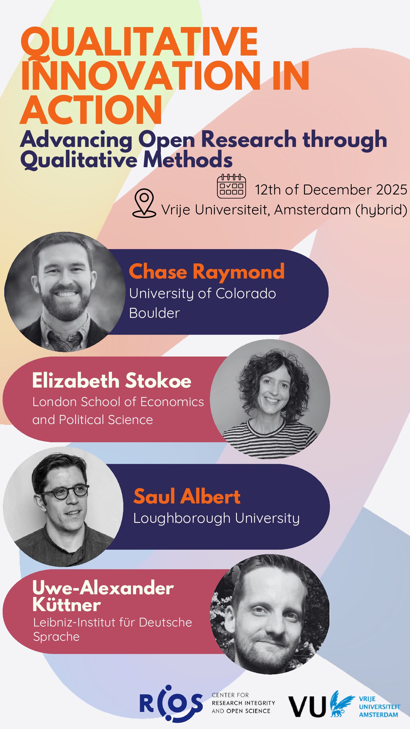 On the 12th of December 2025, we’ll be organising the international symposium “Qualitative Innovation in Action: Advancing Open Research through Qualitative Methods” at the Vrije Universiteit Amsterdam. This one-day event will feature four speakers that will showcaseadvances in Qualitative Open Researchbased on their own work. The symposium will comprise two hybrid plenary talksand two in-person interactive workshops that attendees can choose from. This unique event aims to increase QOR capacity, spark enthusiasm about QOR, and further drive innovation in QOR at the Vrije Universiteit Amsterdam and Amsterdam UMC.