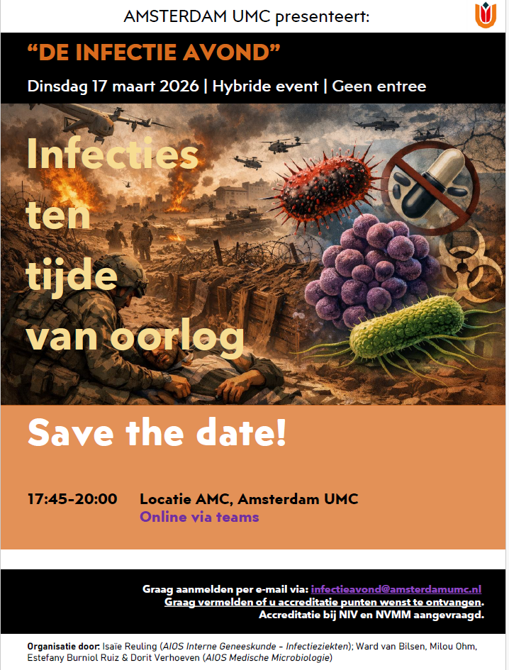 Graag aanmelden per email via: infectieavond@amsterdamumc.nl. Graag vermelden of u accreditatiepunten wenst te ontvangen. Accreditatie is bij NIV en NVMM aangevraagd.