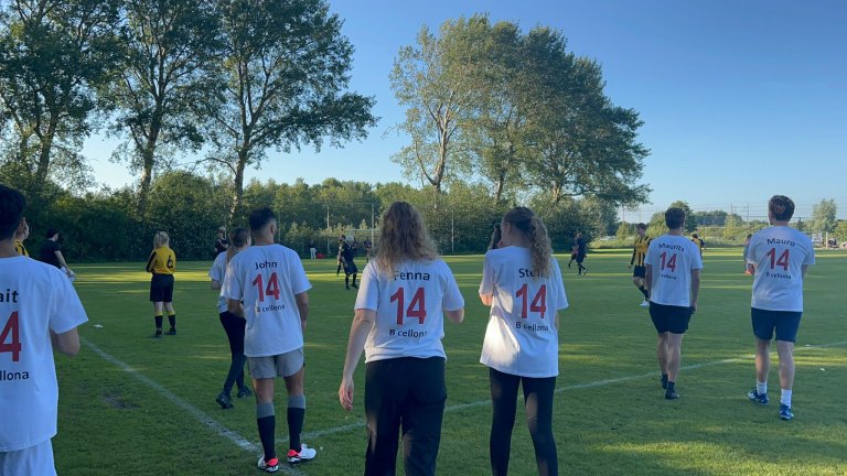 Upon arriving at the FC Abcoude complex, the atmosphere was lively with nostalgic songs playing, drinks flowing, and the sun setting on a perfect summer evening. Excited to play, B cellona faced the department of I.C.T. in their first match. Despite the enthusiasm, the team was unorganized and had no warm-up. Tine, a hockey goalkeeper, valiantly defended the goal, supported by passionate fans Olga, Marcel, and Marga. However, the relentless attacks from I.C.T. soon took their toll. After I.C.T. took the lead, their score quickly escalated. Despite Tine's stunning saves, the opponents increased their score to 5-0.