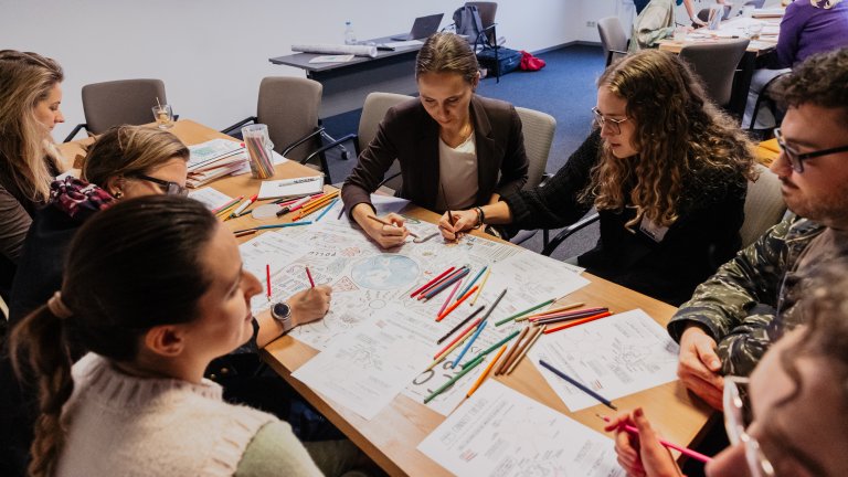 Afterwards, the subgroups got to work collectivelyon a big coloring page. We reflected on how this related to our work, and how the different concepts and objects on the coloring page related to each other. Discussing these very serious and urgent topics felt a bit less heavy as we were working on our coloring pages. In addition, we got to know each other and each other’s research through coloring.