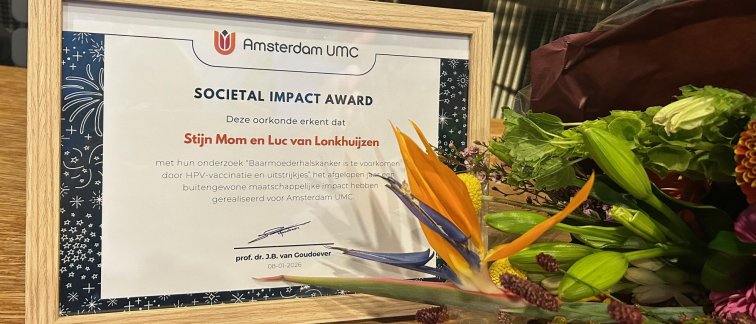 Dr. Stijn Mom and dr. Luc van Lonkhuijzen from Cancer Center Amsterdam have won the Amsterdam UMC Societal Impact Award. The award was presented during the New Year’s reception on January 8 and recognizes research that has a clear societal impact.