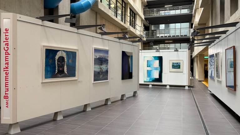 In de Brummelkamp galerie van Amsterdam UMC staat de kleur blauw centraal. Blauw is meer dan alleen een kleur: het verwijst naar ‘blue zones’ op aarde waar mensen opvallend gezond en lang leven, maar ook naar het je ‘blauw voelen’. Blue Monday, zogenaamd de meest deprimerende dag van het jaar, is niet wetenschappelijk bewezen, maar herinnert ons eraan dat iedereen zich wel eens somber voelt.