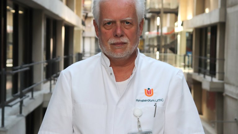 Een opvallende figuur is deze hoogleraar, die zich in het AMC op zijn plaats voelt. Hij heeft hier gestudeerd, maakte een uitstapje in het VUmc voor zijn opleiding tot specialist, en werkte daarna tot zijn pensioen in het AMC. ‘Het AMC zit me gegoten, geweldig mooi ziekenhuis. Hier heb je de mogelijkheid om een beetje uit de pas te lopen. Een soort vrijstaat waar de Amsterdamse mentaliteit klinkt. Je kunt, natuurlijk binnen de grenzen, werken aan wat je belangrijk vindt en dat vind ik heerlijk, Daar kan ik gedijen.’