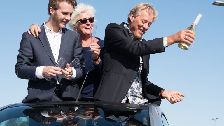 In een felrode Lelijke Eend - met open dak – kwam Eva van Gemeren met familie naar de uitreiking van haar artsdiploma. Ze was eerlijk gezegd een beetje teleurgesteld toen ze de brief kreeg van de faculteit geneeskunde over de diploma-uitreiking. “Ik heb zes jaar heel hard gestudeerd, en dan een diploma-uitreiking op een parkeerplaats? Maar nu ik dit zie… Het is wel heel mooi.” Tussen trossen ballonnen door hadden verkeersregelaars haar naar de ingang van P5 geleid. Daar kreeg ze een fles champagne (alcoholvrij natuurlijk), een set glazen en een gouden envelop met instructies. Want alleen de arts-in-spe mocht de auto verlaten. Alle anderen moesten de uitreikingsceremonie vanuit de auto volgen.