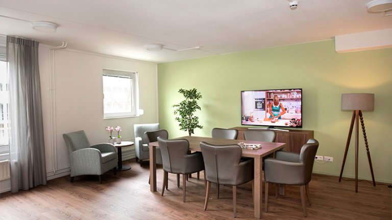 Nadat ze grondig onderzocht was, werd in samenspraak met de geriater besloten om Ria naar de Wijkkliniek te verplaatsen. “Eenmaal in de kliniek, in alle rust op mijn eigen kamer, ging het al snel een stuk beter. Ik was ook meteen weer bij de pinken”, vertelt ze opgewekt en helder, terwijl ze met een boek in de hand in haar eigen zithoek aan een kop thee nipt. Giechelt: “Het voelt nu bijna alsof ik op vakantie ben.” Ze moet vanavond nog wel wat oefeningen doen. “Huiswerk van de fysiotherapeut die hier gisteren langskwam. Dagen in bed liggen is er hier niet bij.” En morgen mag ze alweer naar huis. “Helaas… haha.”